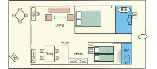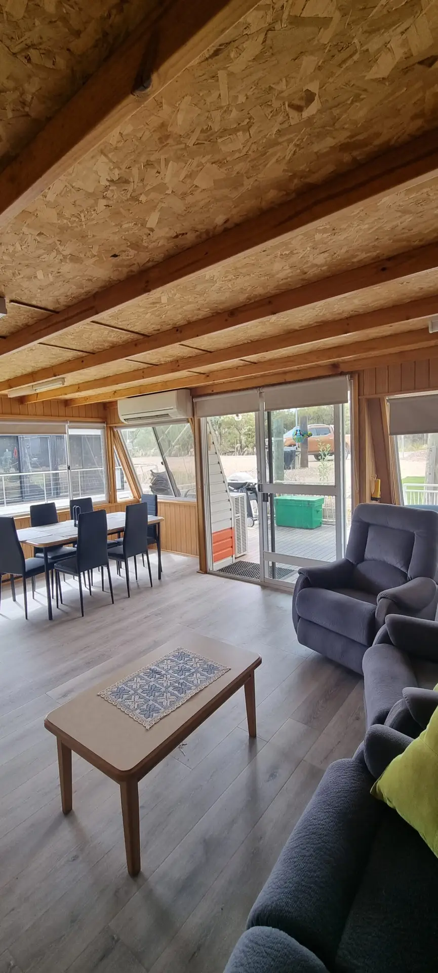 The open plan living area has 6-person dining table, comfortable lounge with a large wall mounted Smart Tv, and reverse cycle split system air conditioner to keep you comfortable all year round.