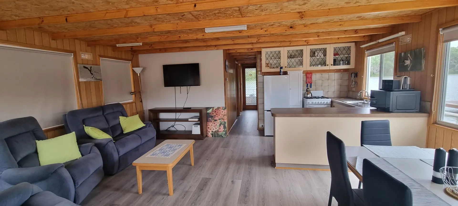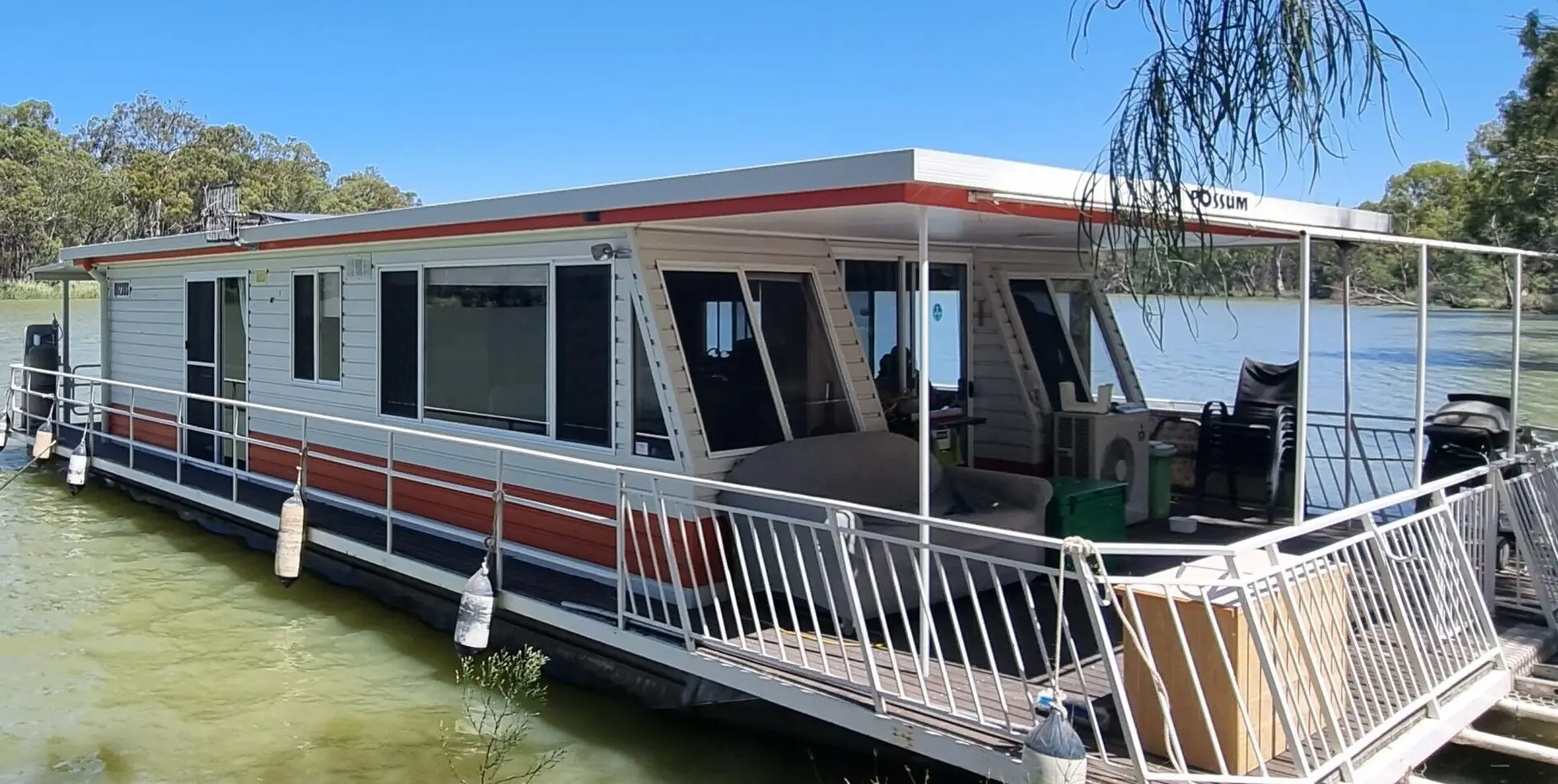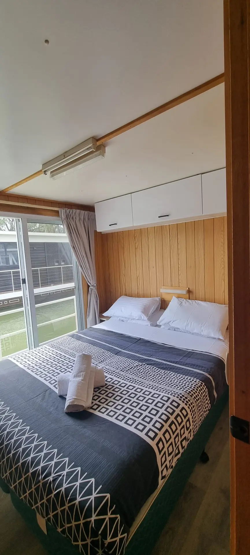 The houseboat has a light and airy feel with both bedrooms having sliding glass doors to the outside deck.