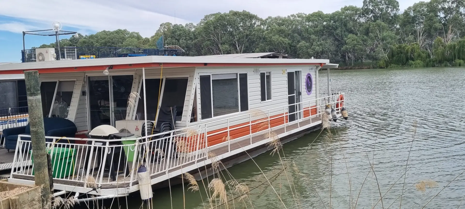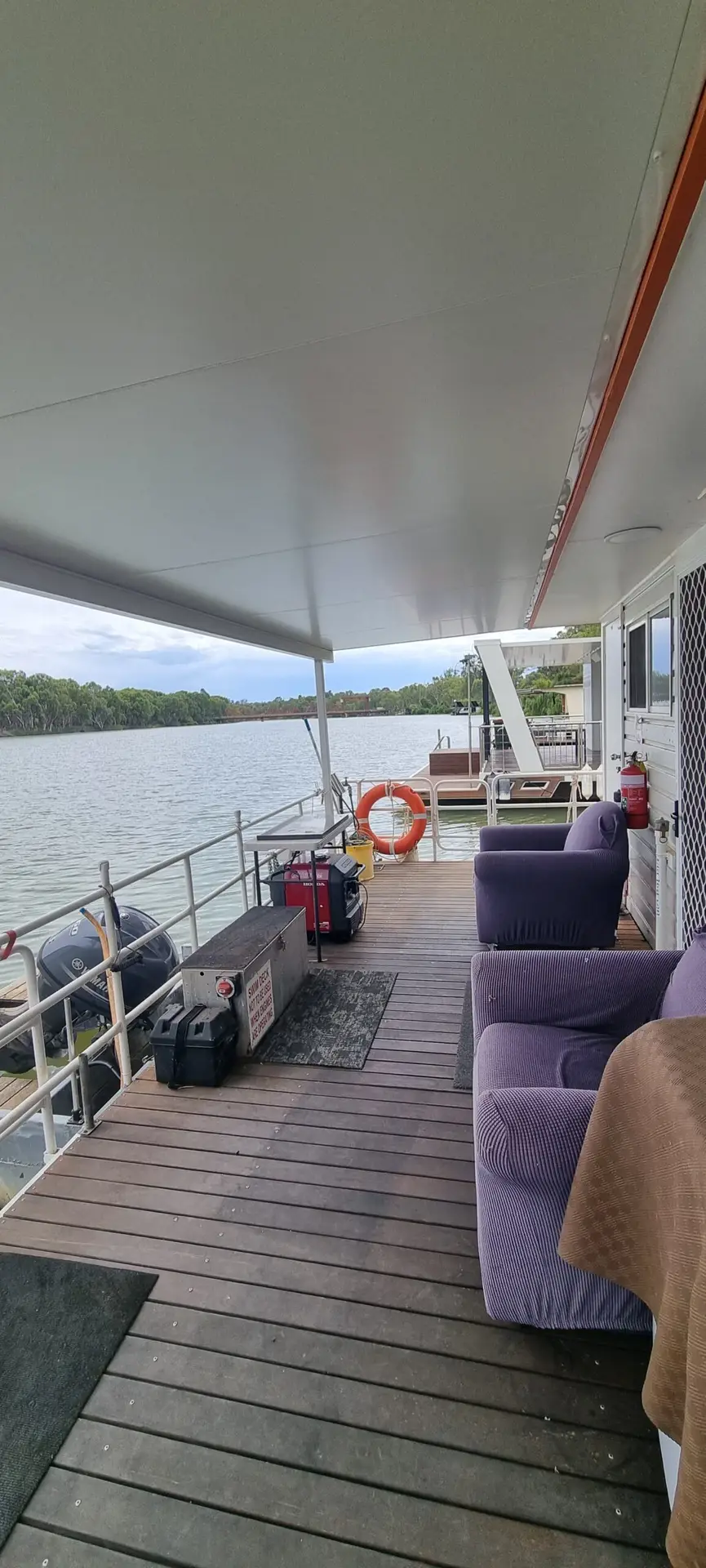 Outside features include a full width rear veranda with table & chairs, swim deck with ladder. Front deck has weber BBQ, ice box and seating.